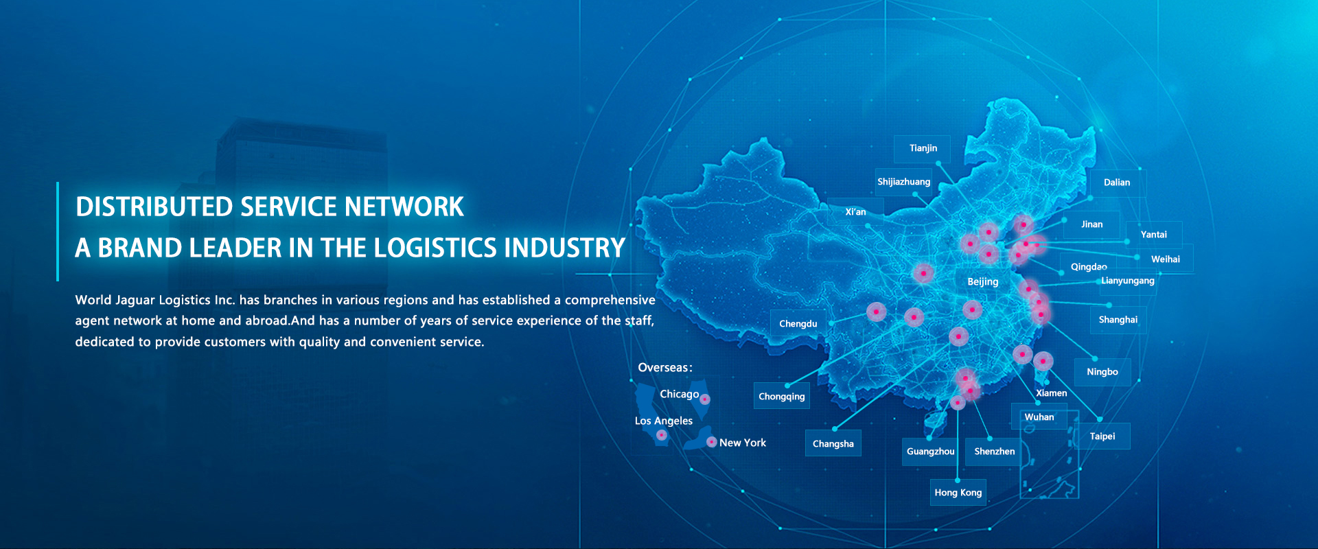 World Jaguar Logistics Inc Tianjin is a troditional Logistics provider,with prefessional team of Ocean Freight, Air freight, Inland Transport, Railway and multimodal Transport,located in Beijing/Tianjin / Hebei Provice economy zone,would focus more on terminal storage,distribution as well as International transport in order to adapt to the new fission age.
